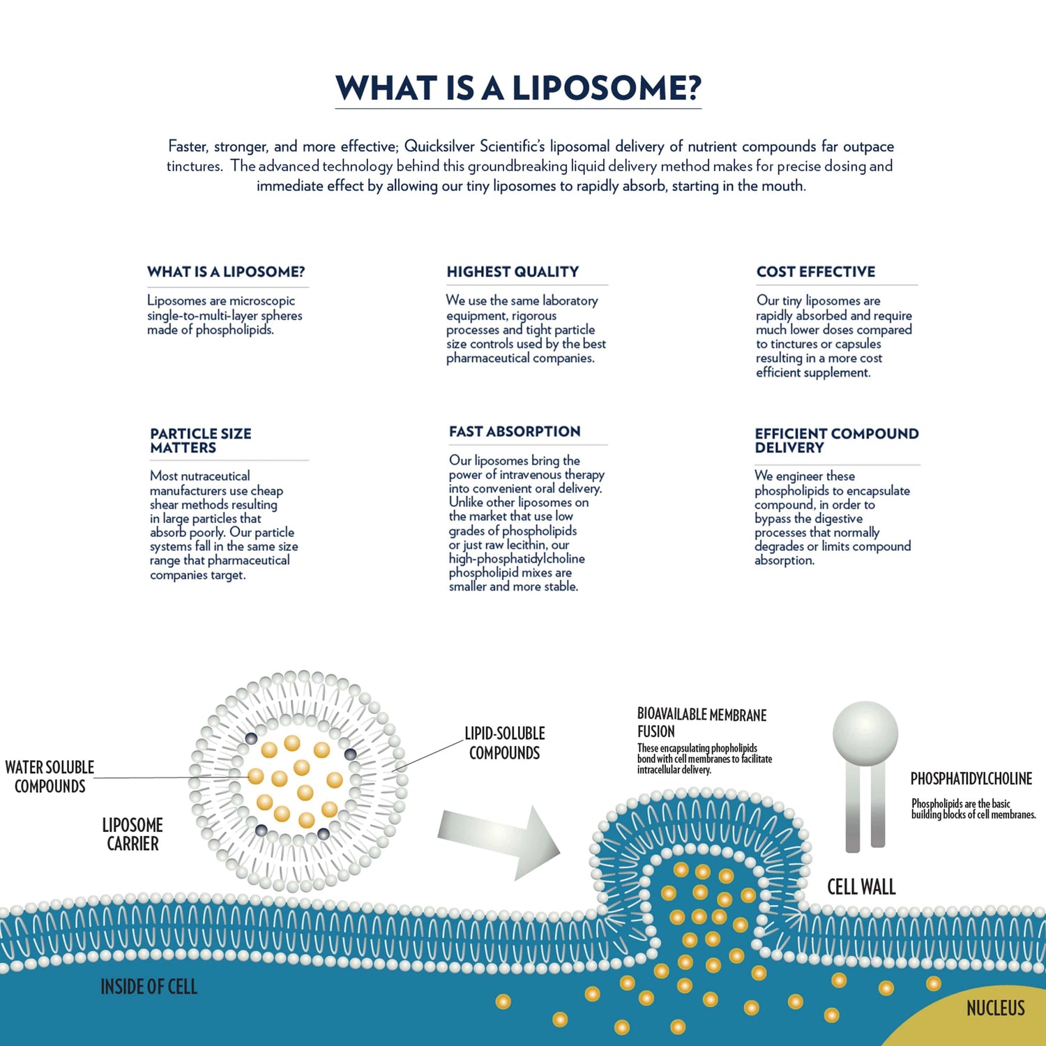 The Quicksilver Delivery Systems® signature trademark sets our liposomal products apart from other companies and ensures an unsurpassed experience. By virtue of our smaller, stable, single-layer spheres, made from the highest quality ingredients available, our liposomal delivery systems improve upon basic liposomal technology.